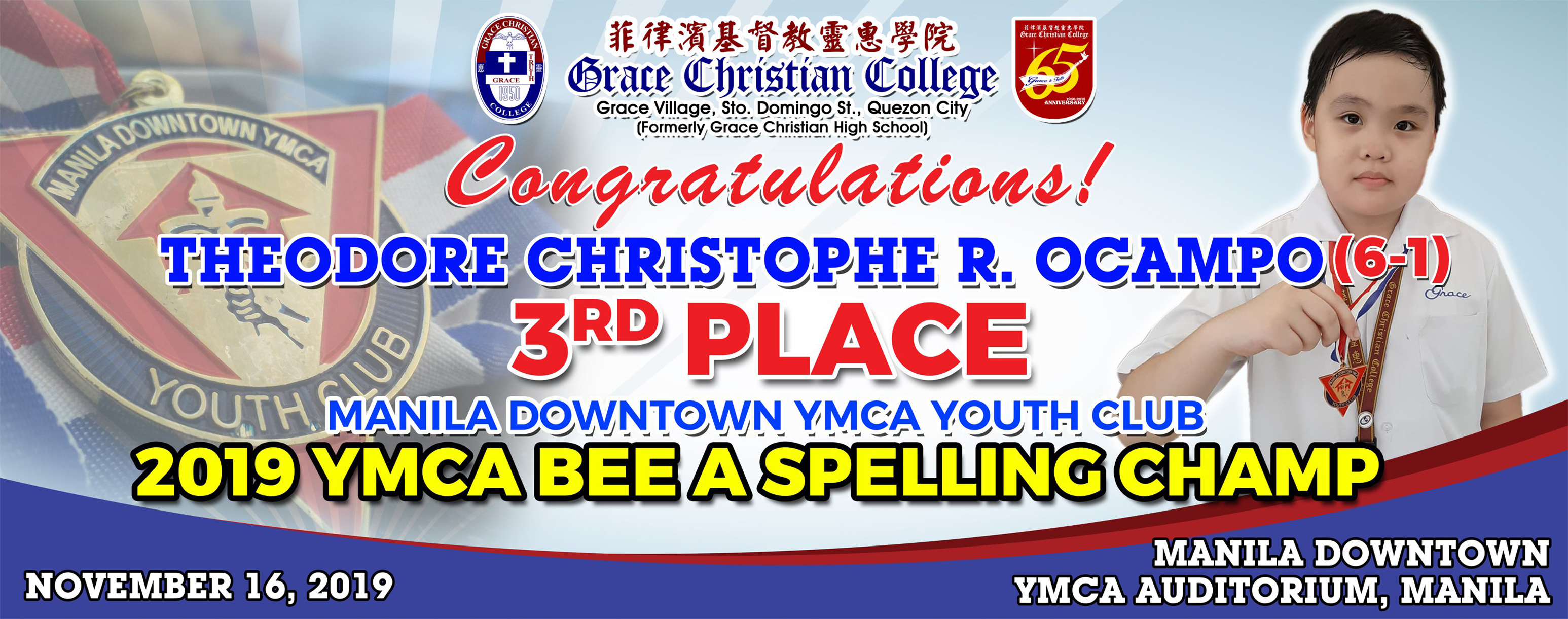 Last November 16, 2019, Theodore Christopher R. OCAMPO (Grade 1-6) took 3rd place in the Manila Downtown YMCA Youth Club 2019 YMCA BEE A SPELLING CHAMP