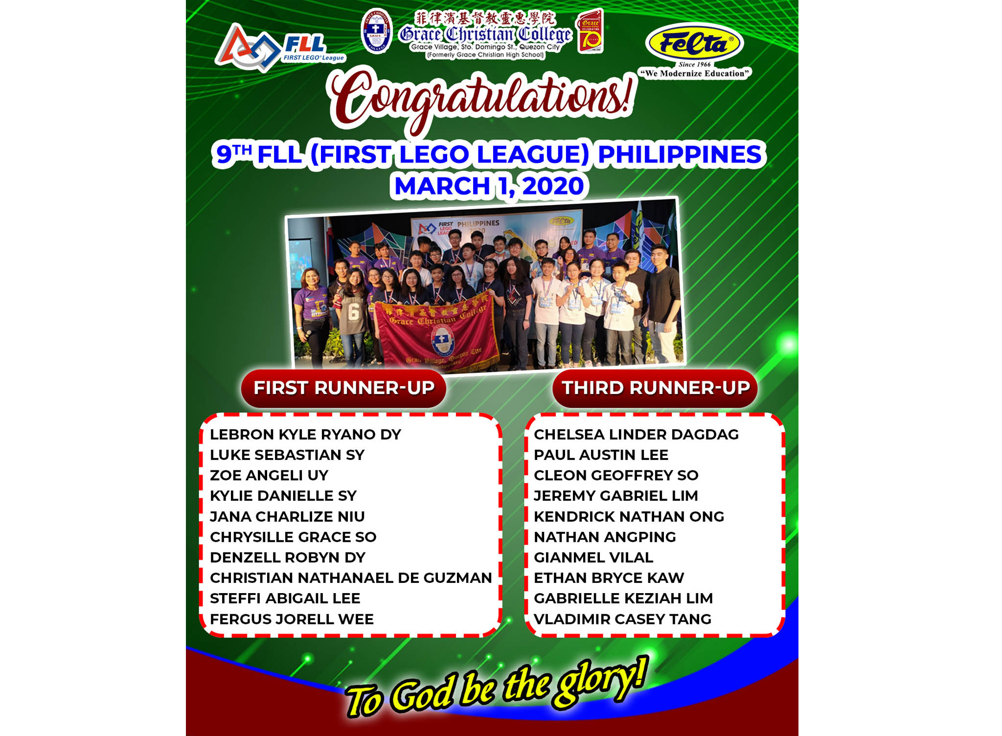 TRIPLE CONGRATULATIONS to Grace Christian College’s ROBOTICS team – Gracean Whiz – for their stellar performance in the 9th FLL (First Lego League) Philippines. Organized by First in Educational Learning Trends Always (FELTA), this annual thematic scientific and technology event took place on March 1, 2020 in De La Salle Santiago Zobel.
